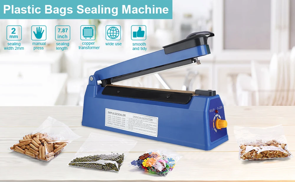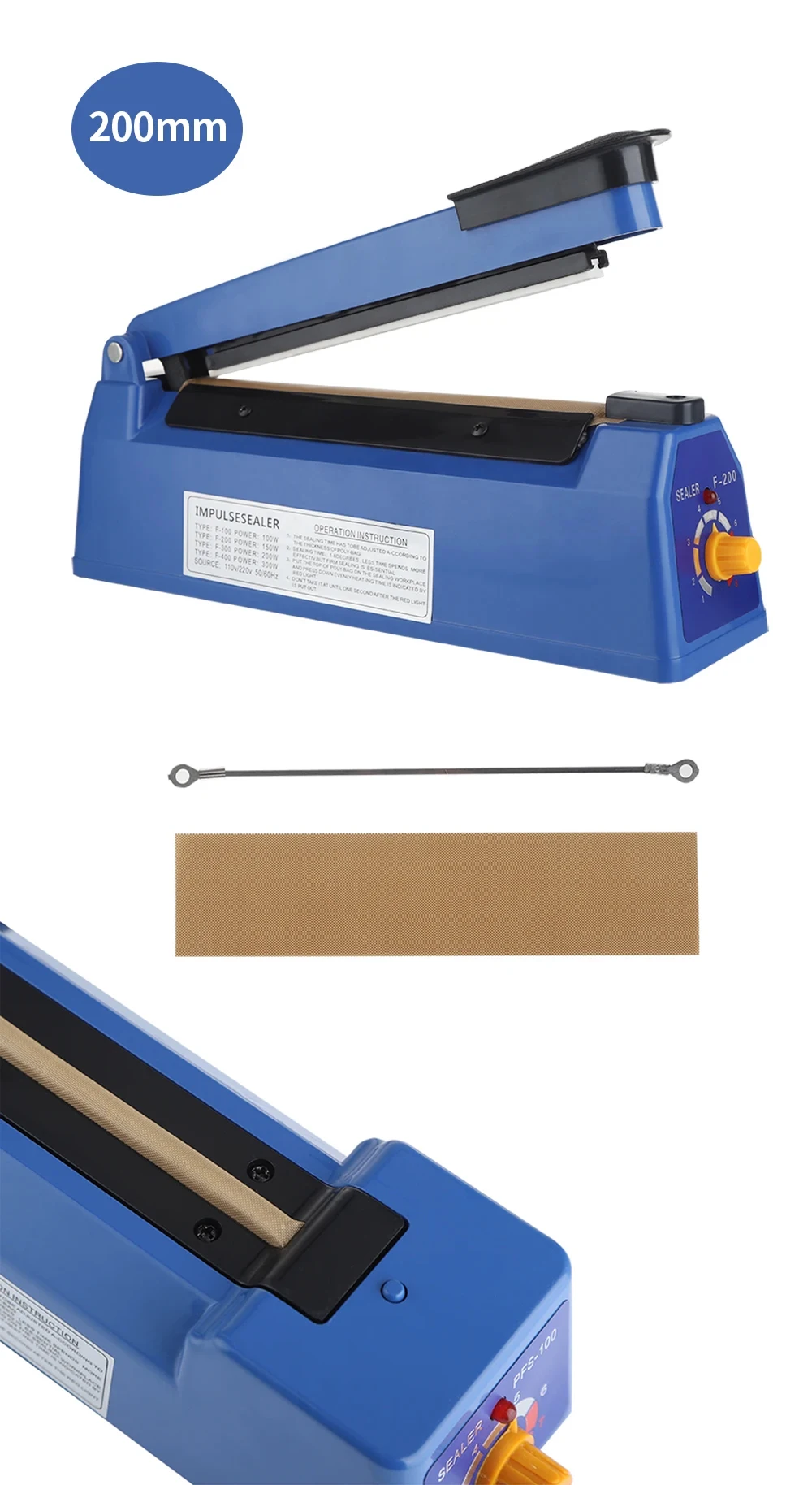 (2)Sealing length is 8 inches (200mm), the sealing width is 2mm,. It designd with metal texture, double-layer coating, good stability and good anti-rust effect. Built-in fuse and heating element can be quickly heated and used safely.It can sealing sweet stuff, drags, medicine and more small goods.